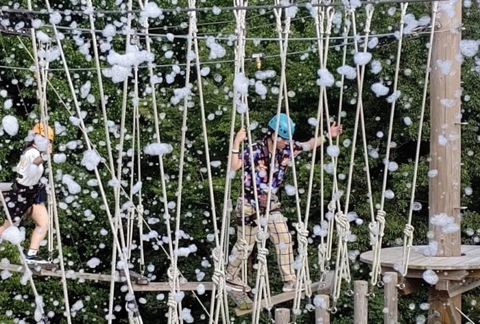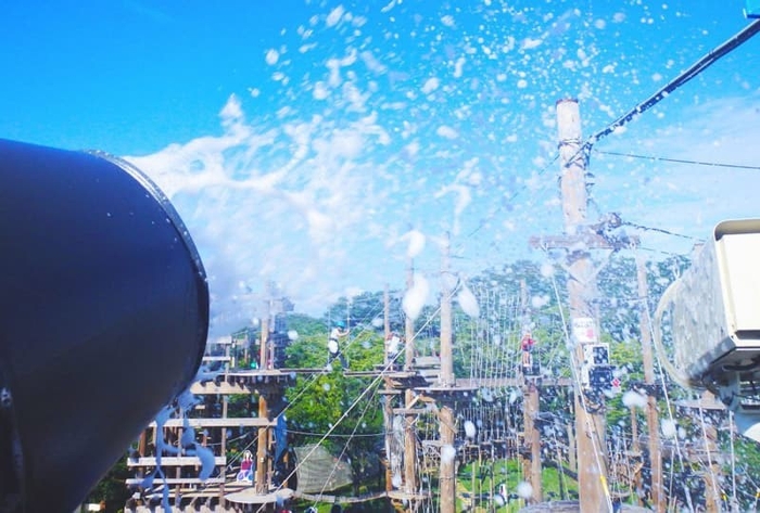 本イベントは、アスレチックのモチーフとなった映画「嵐を呼ぶ アッパレ!戦国大合戦」の登場人物「大蔵井高虎」の陣営からの雪に見立てた泡の攻撃をかわしゴールを目指します。バブル吹雪の量は昨年よりも200%アップし、さらにバーションアップしたアスレチックで残り1週間の冬の淡路島を満喫しよう!