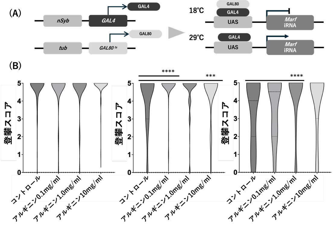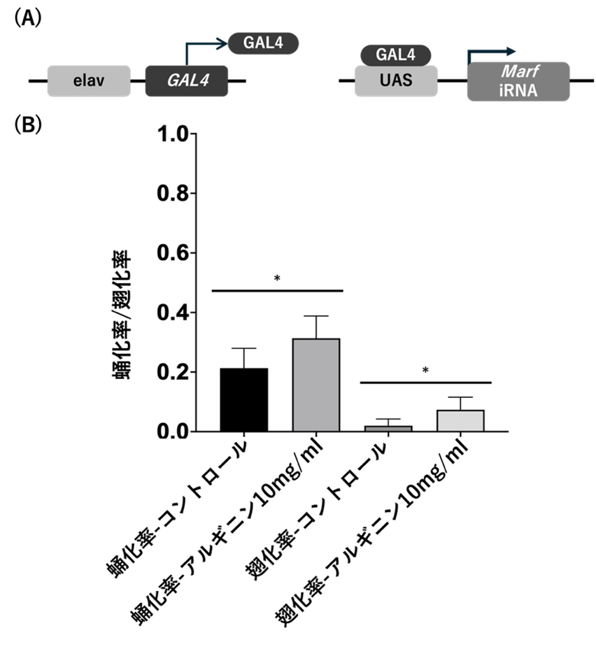 本研究では、ショウジョウバエにおいてMFN2の相同遺伝子(Marf)を神経特異的に抑制したモデルを用い、アルギニン投与の効果を検討しました。発達段階の解析では恒常的なノックダウン系を用い、成虫における解析では温度感受性遺伝子発現制御システム(Gal4/UAS/Gal80ts系)により成虫期から遺伝子発現を誘導しました。