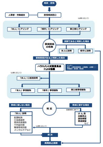 皆さんの会社では、基本的なフローチャートは確立されていますか? ハラスメントの相談があった場合、解決・再発防止措置までの流れをしっかり決めておくことが大切です。