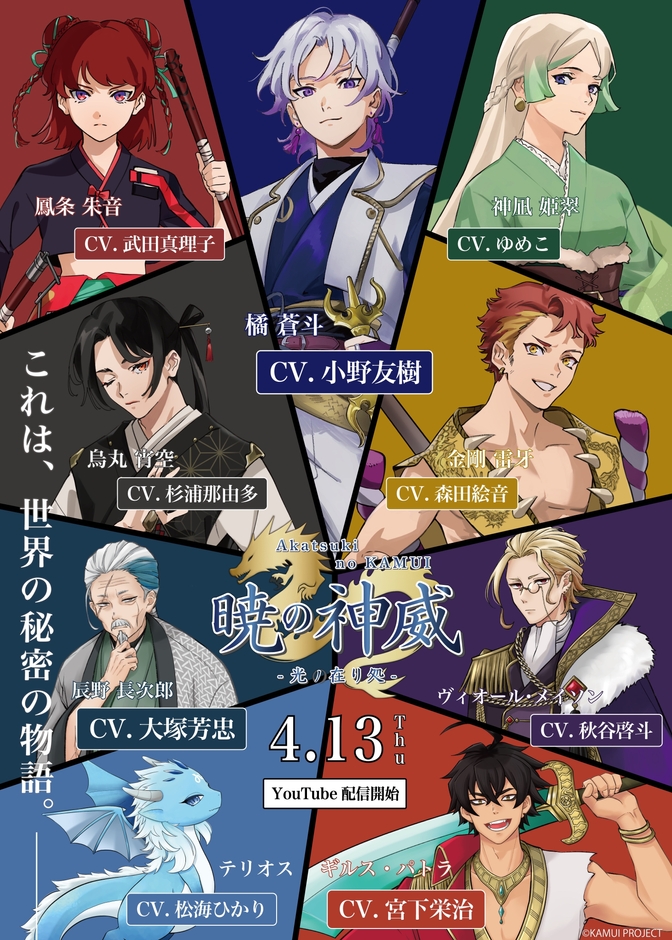 株式会社AVENGEは、龍の加護を受けた者達が世界の秘密に迫る和風ファンタジー、ボイスコミック『暁の神威 -光ノ在り処-』を2023年4月に公開します。主人公 橘 蒼斗(CV:小野友樹さん)の師匠である辰野長次郎役に人気声優 大塚芳忠さんの出演が決定いたしました。ボイスコミック『暁の神威 -光ノ在り処-』は、株式会社AVENGEの企業理念から生まれた5人のキャラクターたちがそれぞれの想いを実現するために世界の謎を解き明かしながら成長し、『光ノ在り処』を目指す物語です。公式YouTubeチャンネル「暁の神威 -光ノ在り処-《KAMUI PROJECT》」にて2023年4月13日公開予定。