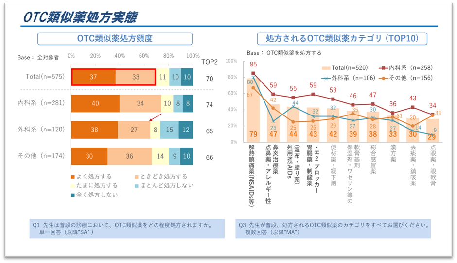 - 内科系医師では処方率がさらに高く:74%が「よく・ときどき処方」