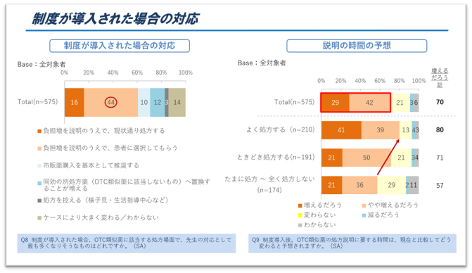 制度の趣旨を患者に説明し、同意を取り、必要に応じて記録を残す――。こうした対応の多くが、実際には医療現場の医師とスタッフに委ねられることになります。 今回の調査でも、制度導入後の対応として最も多かったのは「負担増を説明したうえで患者に選択してもらう」が44%でした。また、OTC類似薬の処方説明に要する時間については、医師の70%が「増える/やや増える」と予想しています。制度の趣旨自体を理解する声がある一方で、その運用を誰がどのように担うのかという点について、現場では実務面の負担を懸念する声も少なくありません。(図4)