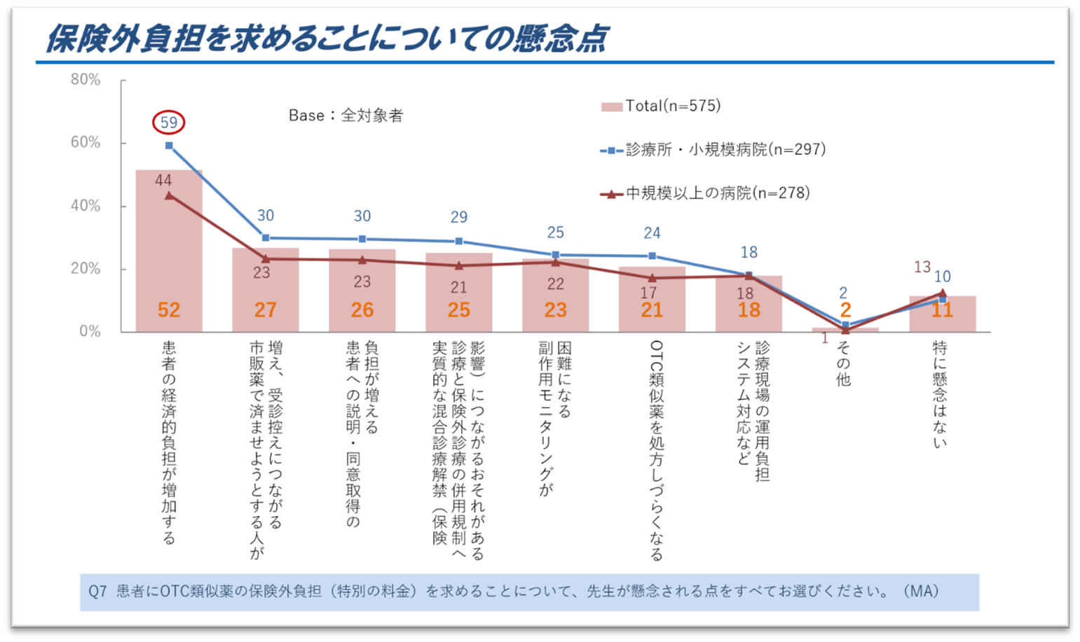 - 診療所・小規模病院では「患者経済負担」懸念:59%(中規模以上より15pt高)