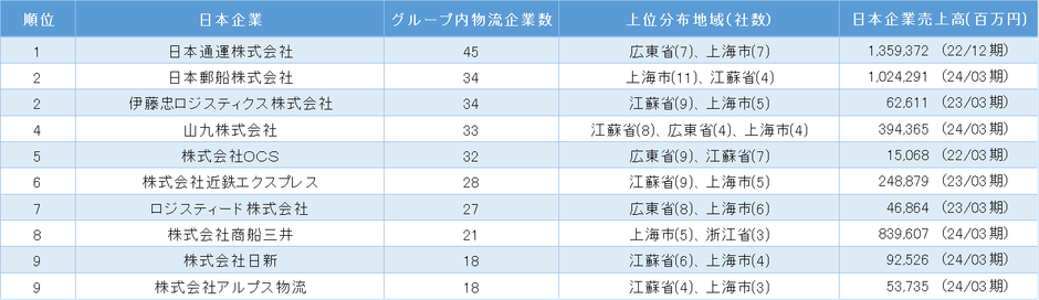 日系の物流業に対して、日本の親会社と紐付けた企業数をもとにランキングを作成したところ、1位「日本通運」(45社)、同順2位「日本郵船」「伊藤忠ロジスティクス」(34社)、4位「山九」(33社)という結果になりました。(表1)