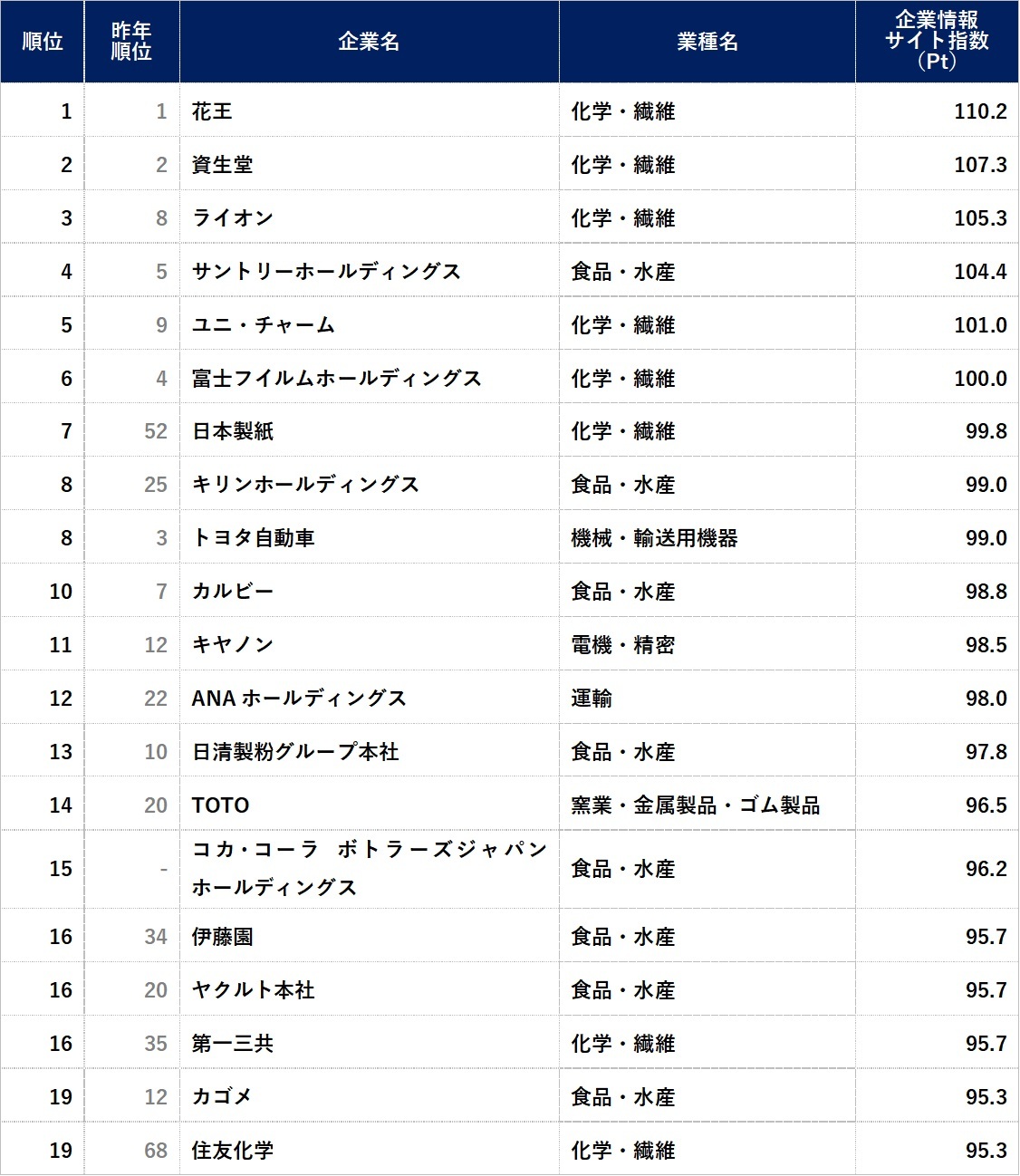 上位には「化学・繊維」、「食品・水産」の企業が多く並びました。