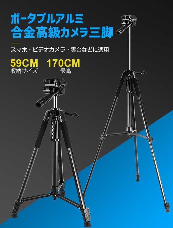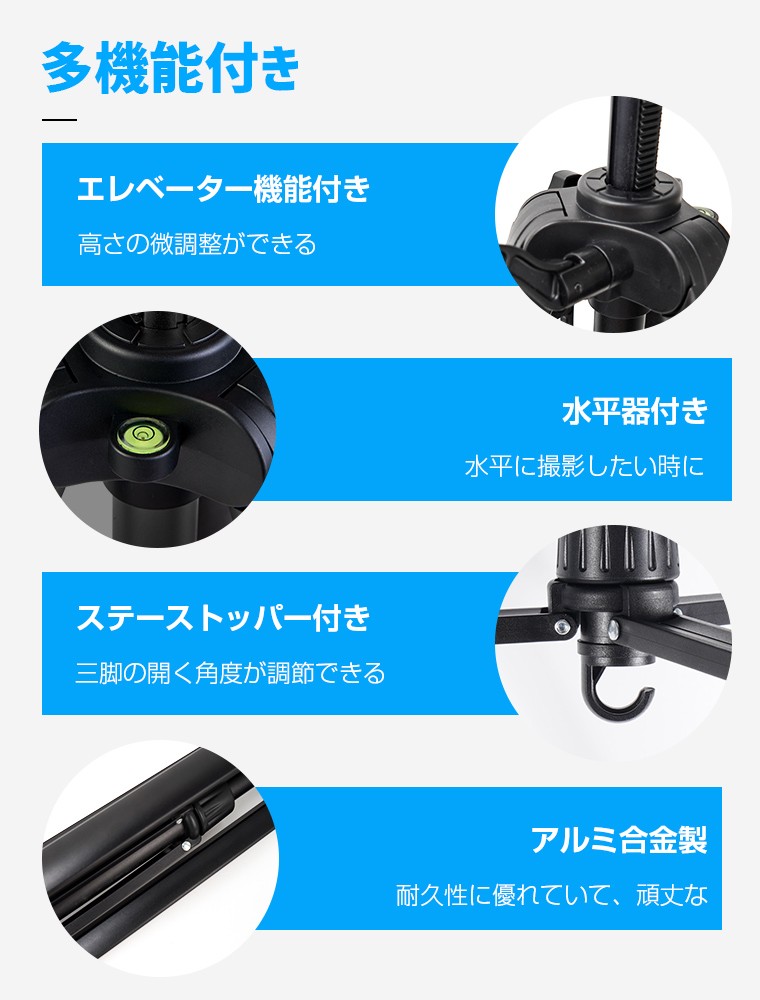 59〜170cm高さ調整、リモコン付き。スマホもカメラも使える高コスパモデル。