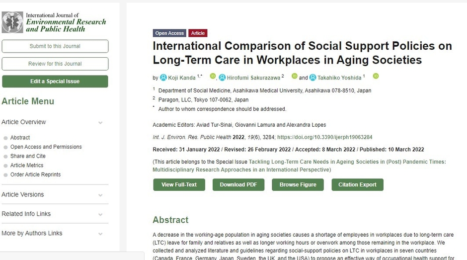 Int. J. Environ. Res. Public Health誌はインパクトファクターが3.39もある著明な公衆衛生学に関する国際的専門誌です。それが「ポストコロナ時代、長寿社会における介護支援ニーズ:国際的視点から鑑みた多面的検討のあり方とは(原題 Tackling Long-Term Care Needs in Ageing Societies in (Post) Pandemic Times: Multidisciplinary Research Approaches in an International Perspective)」という特集号を組み、2022年7月末まで、題名に相応しい論文寄稿を募集しています。そこに合同会社パラゴン(本社:東京都港区 URL: https://pro-sangyoui.com )代表の櫻澤 博文も共著者として寄稿したところ3月10日付けで採択され、この程オンラインで公開( https://www.mdpi.com/1660-4601/19/6/3284 )されました。筆頭執筆者は旭川医科大学医学部社会医学部講座講師の神田 浩路先生( https://researchmap.jp/kojikanda )です。