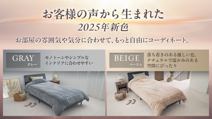 発売当初より「冬でも快適に眠れる掛け布団」としてご好評をいただき、黒一色のシックなデザインは幅広い世代に支持されてきました。一方で、「部屋の雰囲気に合わせたい」「インテリアになじむ色が欲しい」といった声も多く寄せられました。そこで2025年シーズンは、柔らかな雰囲気のベージュと落ち着きのあるグレーを新たに追加。選べる楽しさが広がるラインナップとなりました。
