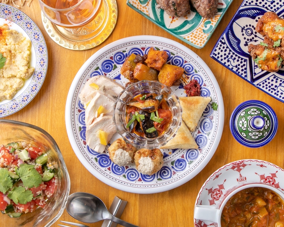 ランチとディナーでは、与野店でも人気メニューだったモロッコを代表する料理である 「タジン鍋」や「フムス」をご提供。スパイスと素材の旨みを丁寧に引き出した一皿一皿は、レアエスニック初心者の方にも親しみやすい味わいです。