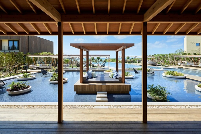 一般的にゲストがくつろぐ空間とされるのは客室ですが、星のや沖縄では敷地全体をゲストの居場所と捉え、居心地の良い場所がバリエーション豊富に用意されています。海に開かれたプールもその一つです。星のや沖縄のプールは、泳ぐためだけではなく、集まる場所であり大きな拠点でもあります。泳いだり、ごろごろしたり、星のや沖縄のプールは、リゾートの日常生活を感じられます。