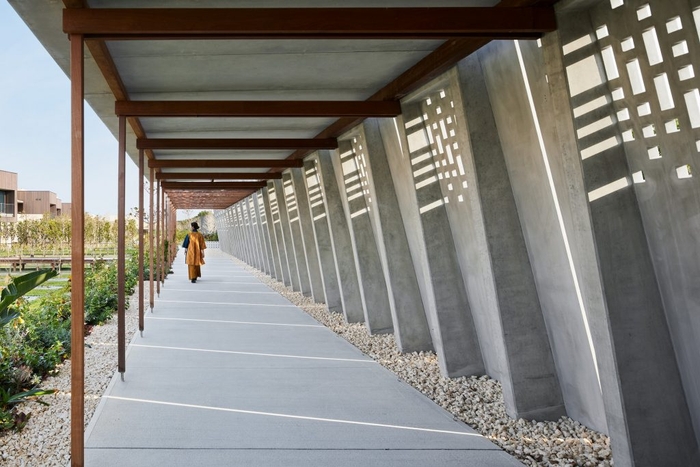 星のやの開発は、現地視察から始まり、その土地でしかできないことを議論しながら、世界観を決める軸となるコンセプトを作ります。星のや沖縄のテーマとなった「グスクの居館」。沖縄の史跡「グスク」を三人の専門家はどう読み解き、どう表現したのか。グスクの中には一つの暮らしの場があり、どこにいても海を感じられる建屋に、人の手を感じる畑があり、庭がある。台風や海風から守る沖縄の建築に欠かせないコンクリートで造られたグスクウォールは、無機質ながらも風や太陽の光が抜け、人々の暮らしが漏れ出すような、ぬくもりさえも感じます。グスクウォールをくぐると、ずっと昔からあったような世界が広がります。
