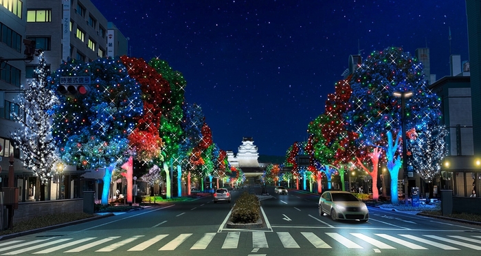 姫路駅前から姫路城まで続く大手前通りのクスノキやイチョウを約22万球のフルカラーLED等で煌びやかに彩り、姫路城の彩雲ライトアップと連動した一体感のある演出でまちなか全体が光の空間に包まれます。
