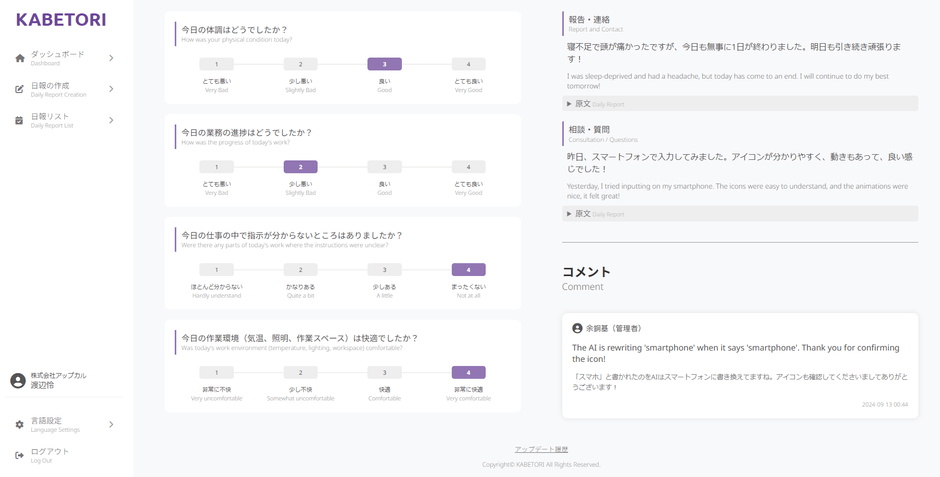 KABETORIでは母語で入力するだけでAIが日本語の日報形式へリライト。原文・直訳・リライト文を同時保存するため、意思疎通と記録作成が一度で完了します。翻訳はゴールではなく、対話を可視化し課題を抽出するための入口―これが開発思想の出発点です。
