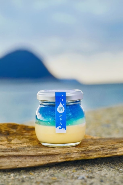 萩の海をイメージした道の駅「萩しーまーと」でも発売するプリンです。海をイメージした爽やかな青色で、どことなく昔懐かしいプリンへ仕上がりました。しーまーとで魚介料理をお召し上がりになった後のデザートにもぴったりのプリンです。