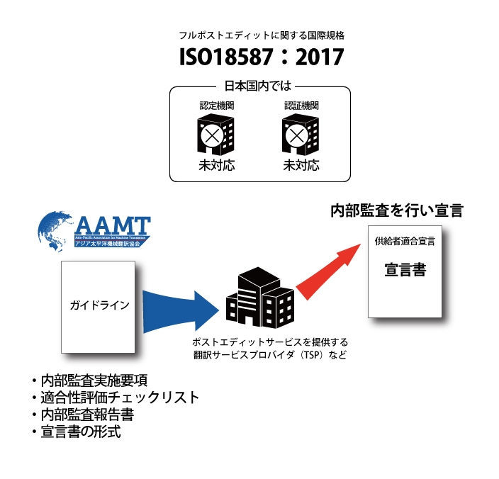 機械翻訳の普及・改良を目的として、機械翻訳に関する情報発信やステークホルダー間の情報交換を行っている一般社団法人アジア太平洋機械翻訳協会(1991年創立、所在地:京都府相楽郡、会長:隅田 英一郎、以下 AAMT)は、機械翻訳が出力した訳文を人手で修正する“ポストエディット”が普及する中、利用者がISO 18587の「供給者適合宣言」を行うためのガイドライン文書を制定しました。