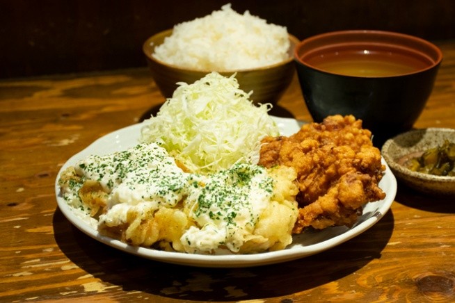 ジューシーな唐揚げと甘酸っぱいチキン南蛮が一度に楽しめる、鶏好きにはたまらない一皿。お腹いっぱい鶏料理を楽しみたいランチにぴったりです。