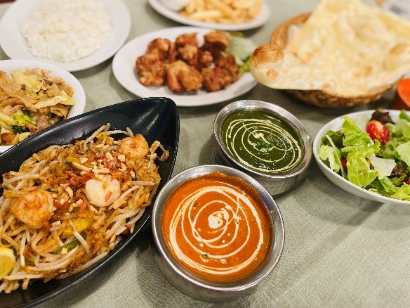 味わいの異なるカレーや、香ばしく焼き上げたナン、エスニックなタイヌードルまで、多彩なラインナップを心ゆくまでお楽しみいただけます。