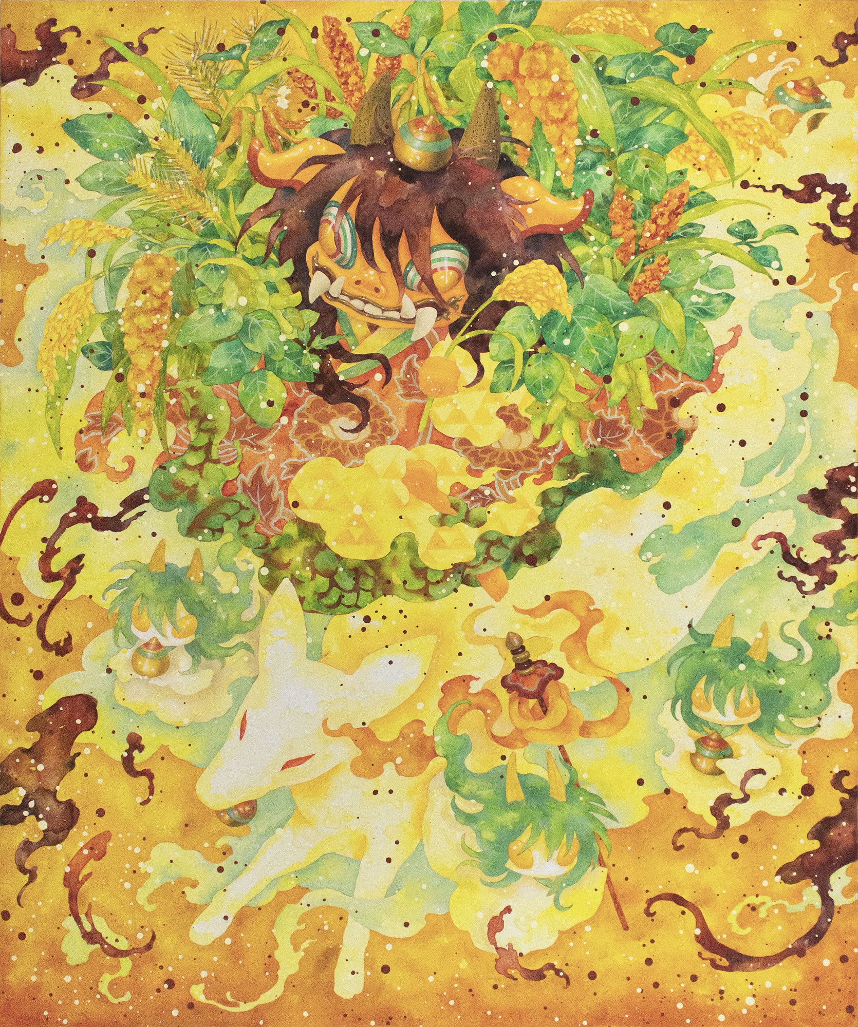 題材からイメージする神聖な世界観と二人が描く作品・作風の神秘性などに親和性を感じることから二人展の開催に至りました。狐、物の怪(モノノケ)、鬼、天狗、神社、神事など古来からの日本伝統文化の伝承に係わるものが描かれる作品の世界観は、