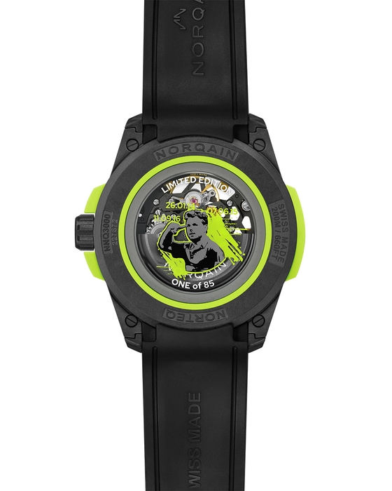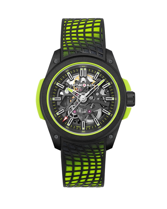 黄緑のアクセントを配したスケルトン仕様のブラックダイヤルの奥には、クロノメーター認定を受けた自動巻きスケルトンムーブメント「ノルケイン キャリバー NB08S」が搭載されており、41時間のパワーリザーブを備えています。