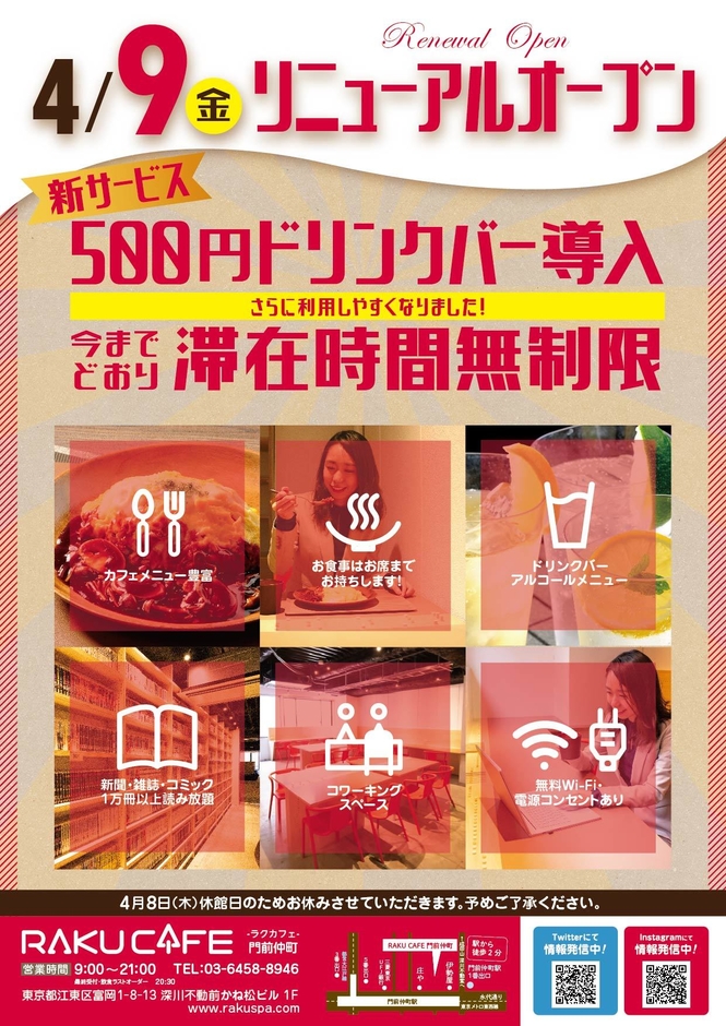 株式会社極楽湯(本社:東京都千代田区、代表取締役社長:新川 隆丈)により、東京都江東区門前仲町にて運営される「RAKU CAFE 門前仲町」が、フリードリンク制(時間無制限)やモバイルオーダーシステム導入といった、ご利用方法を大きく変更し令和3年4月9日よりリニューアルオープンいたします。