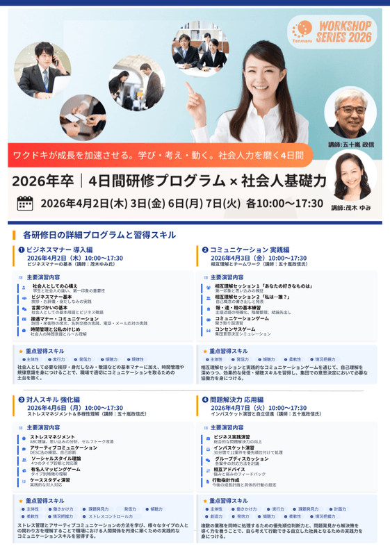1社1名から参加可能、“妥協しない”新入社員向け4日間研修 ~社会人基礎力とポータブルスキルを体系的に学ぶ公開型プログラム~