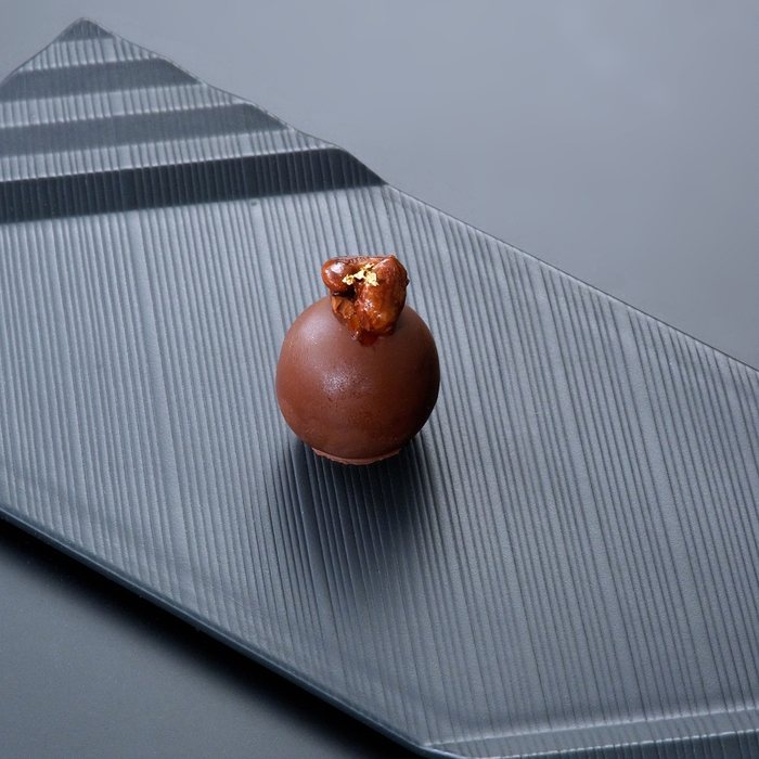 甘さの中にほろ苦さがあるチョコレートのムースを閉じ込めた一品。ビターなチョコレートムースに、ベリーのクーリでアクセントを、モナカで食感を加えています。