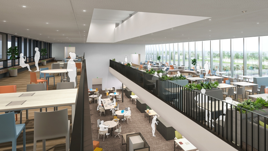 宇部工場は経口固形剤の製剤専用工場で、さまざまなエンジニアリング技術を導入した自動化工場です。今回竣工するSF棟は、従業員の執務エリアや会議室、カフェテリアと来訪者をお迎えするゲストスペースを備えています。建物内にはスキップフロアと吹き抜けを設けることで執務空間に一体感を醸成し、従業員同士や部署間の円滑なコミュニケーションを促進する環境を整備しました。また、太陽光パネルや自然換気システムなどの省エネシステムを導入することで地球環境にも配慮し、昨日3月27日には山口県において3例目となるZEB(注1)認証を取得しています。