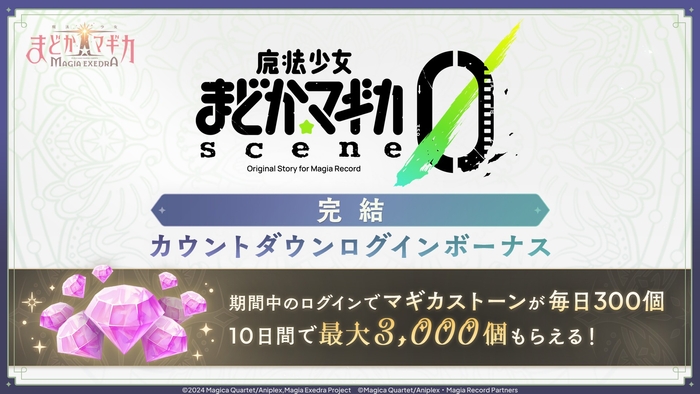 11月8日(土)12時より、『魔法少女まどか☆マギカ scene0』の完結に向けたカウントダウンとして、ログインでマギカストーンを1日300個手に入れることができ、期間中10日間ログインいただくことでマギカストーン最大3,000個獲得いただけるログインボーナスを開催いたします。