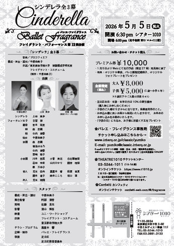 バレエ・フレイグランス(主宰:中原由美子)主催、『フレイグラント・パフォーマンス第12回公演「シンデレラ」全3幕』が2026年5月5日 (火・祝)にシアター1010(東京都 足立区 千住 3丁目92 北千住駅西口 マルイ11階)にて上演されます。