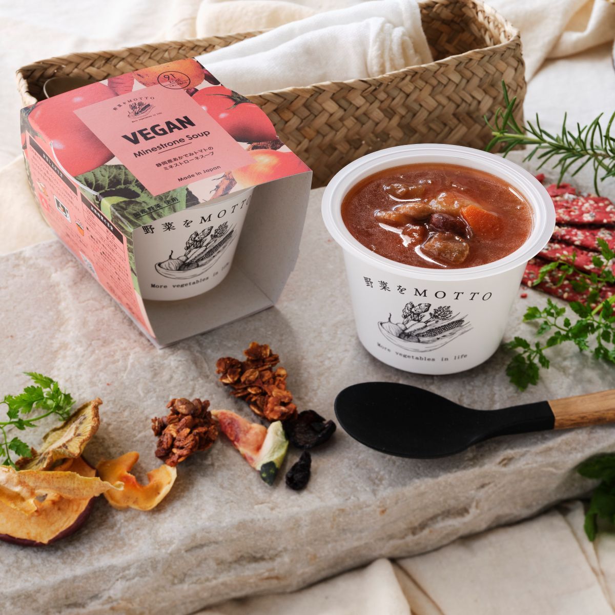 お客様からの「ヴィーガンに対応した商品はありますか?」というお声に応えるために、野菜をMOTTOからミネストローネ・かぼちゃスープ・豆乳クリームスープの3種類のヴィーガンスープが登場しました。