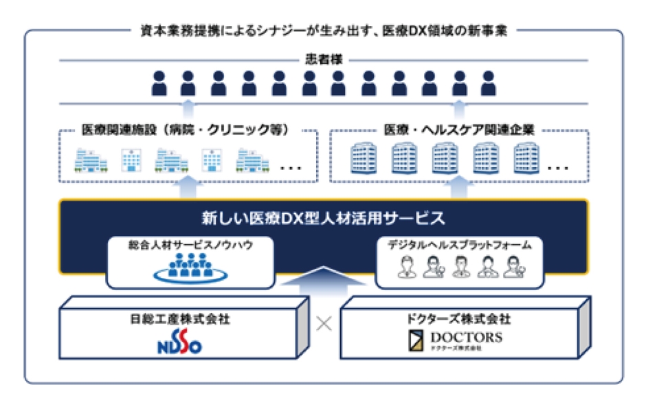 日総工産株式会社(本社:神奈川県横浜市、代表取締役社長執行役員兼CEO 清水 竜一、以下「日総工産」)は、ドクターズ株式会社(本社:東京都港区、代表取締役社長兼CEO 柳川 貴雄、以下、「ドクターズ」)との間で、資本参加を含む業務提携の基本合意契約を締結いたしましたので、下記のとおりお知らせいたします。