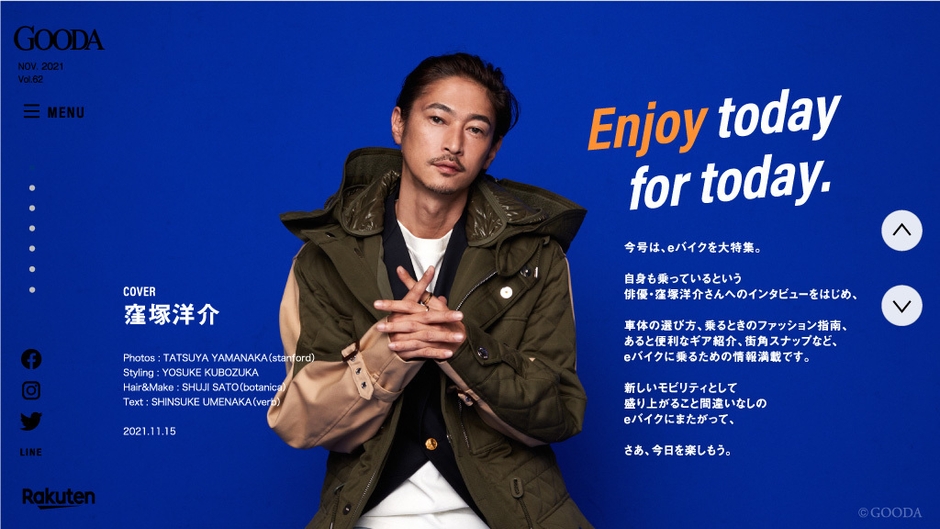 手にするだけで毎日ちょっとハッピーな気持ちになれる。そんなとっておきを紹介している「GOODA」。eバイクを特集した今号の表紙には、2017年にマーティン・スコセッシの監督作「Silence-沈黙-」でハリウッドデビューを果たし、2020年にはBBCとNetflixの共同制作シリーズ「Giri/Haji」にも出演している俳優・窪塚洋介さんが登場します。「艶」「アーバン」「モノトーン」という3つのお題をもとに窪塚洋介さん本人が、私服を使ってスタイリングしたファッションページは、茶目っ気と大人の色気が共存する上質なコーディネイトで、窪塚ワールド全開といった仕上がりに。窪塚洋介がいま着たい秋冬コーデというべきスタイリングは必見です。インタビューでは、今号の特集であるeバイクについて、自身を含め息子も乗っていることや、最近ハマっているという“腸活”では1日1.5食を摂ることを心がけていることを話してくれた。また、舞い込む多くのオファーから、どうやって出演作を選んでいるのか?という質問に対しては「胸のドキドキが基準です。20数年、俳優をやってきているので、引き受けて後悔しないか、何となくわかるんですよ」と、キャリアを積むことで、勘が働くようになっていることなどを話してくれた。