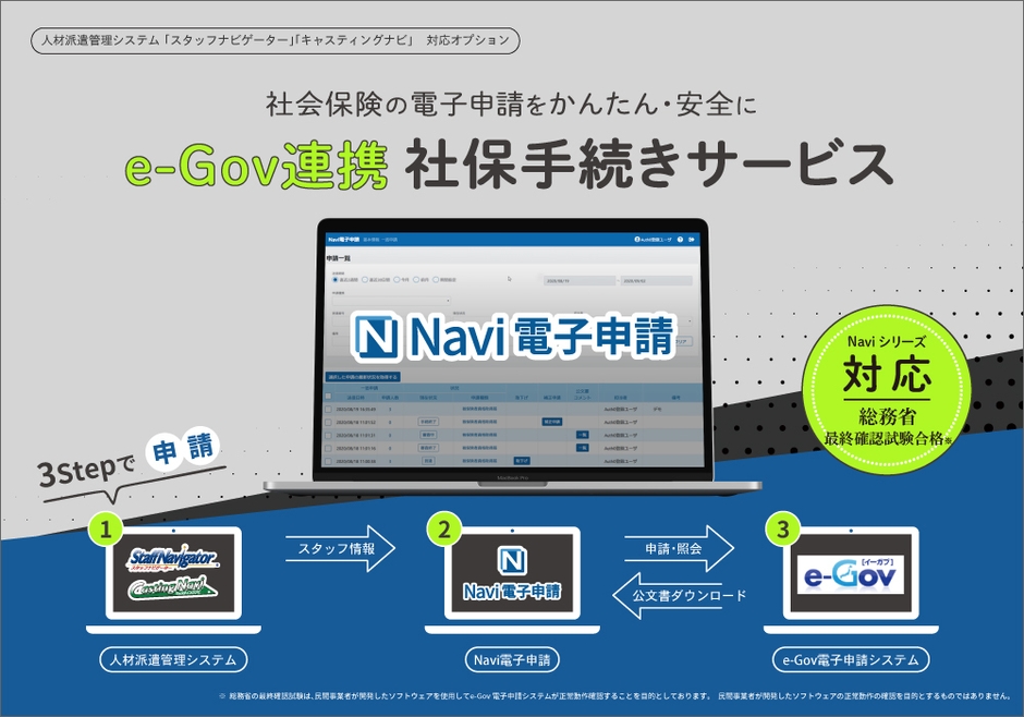 「Navi電子申請」は、社会保険のe-Gov電子申請をかんたん・安全に行えるWebサービスです。同社製品の人材派遣管理システム「スタッフナビゲーター」「キャスティングナビ」から従業員情報をNavi電子申請に取込み、そのままe-Gov電子申請手続きを行えます。