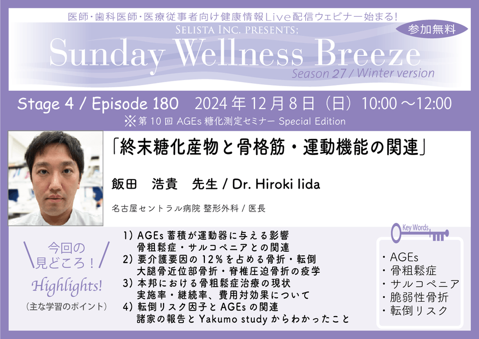 《医師・歯科医師・薬剤師向け》無料オンラインセミナー 12/8(日)朝10時開催『終末糖化産物と骨格筋・運動機能の関連』 講師:飯田 浩貴 先生(名古屋セントラル病院 整形外科/医長)