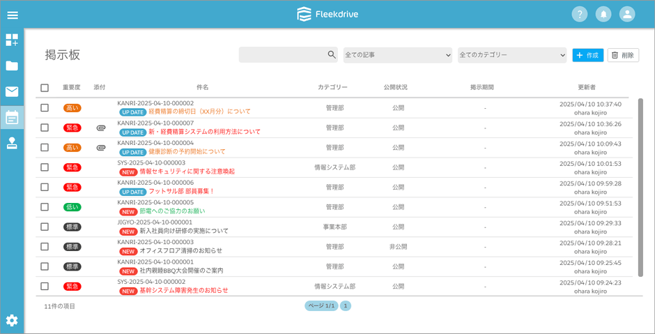 掲示板は、業務に関するお知らせやルールなど組織内で必要な情報を共有するための場所です。個別連絡で起こりがちな情報のばらつきや伝達漏れを防ぎ、Fleekdrive上のメンバーに均一に共有することが可能になります。