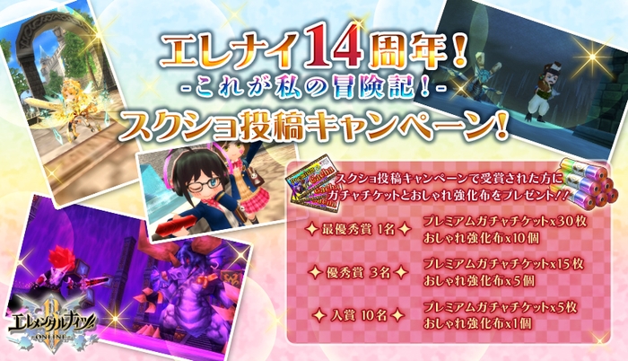 今までのキャンペーンや日常で撮影した思い出のスクショに一言添え、「#エレナイ14周年」を付けて投稿しよう!当選で14名様にガチャチケットと新アイテム「おしゃれ強化布」をプレゼント!!