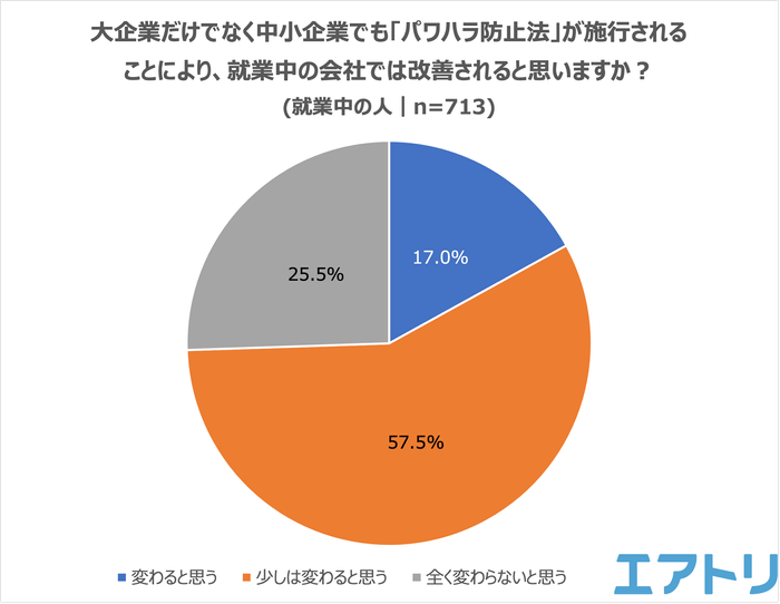 今回、中小企業においても施行される「パワハラ防止法」によって改善されるかどうかを聞いたところ、「少しは変わると思う(57.5%)」「変わると思う(17.0%)」と合わせて74.5%の人が改善されることを期待しているとわかりました。一方で「全く変わらないと思う」と回答した人は25.5%になりました。