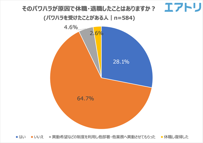 パワハラを受けたことがある人の中で、パワハラが原因で休職・退職したことが「ある」人は28.1%でした。「いいえ」と回答した人は64.7%と最も多い回答となりました。