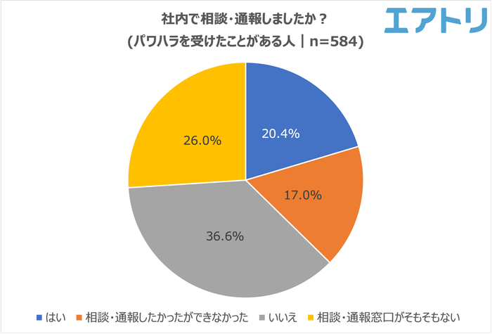 パワハラを受けたことがある人に社内で相談・通報したかを聞いたところ、「はい」が20.4%と2割しか相談・通報されていないことがわかりました。一方で「相談・通報したかったができなかった(17.0%)」、「いいえ(36.6%)」、「相談・通報窓口がそもそもない(26.0%)」と何らかの理由で相談・通報していない人は79.6%にのぼります。