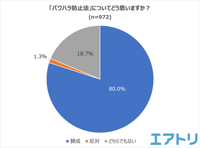 「パワハラ防止法」についてどう思うかを聞いたところ、「賛成」が80.0%、「反対」が1.3%、「どちらでもない」が18.7%となりました。