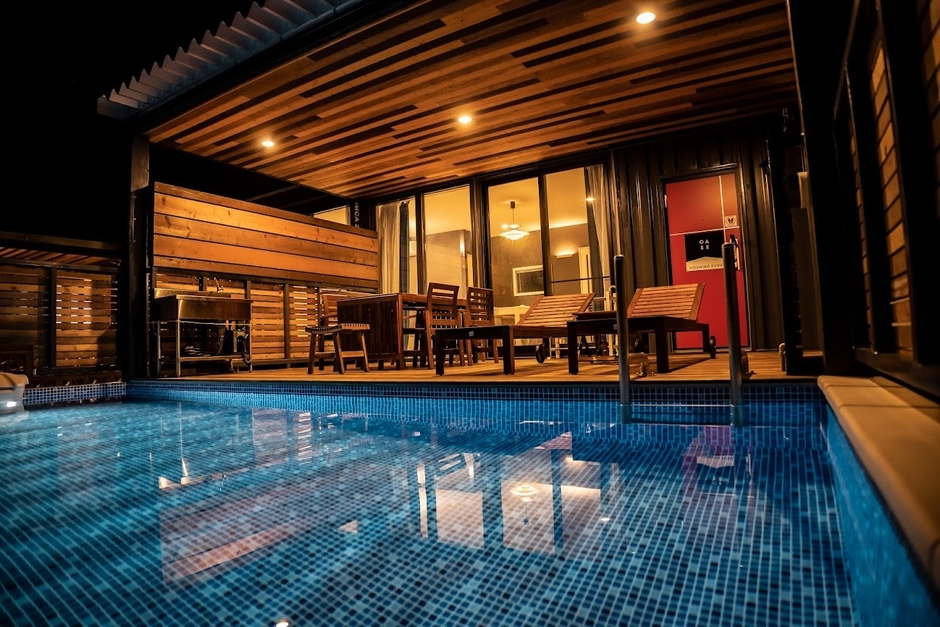 お部屋を出たら5歩で入れるプール付きです。夜になれば水に浮かびながら満点の星空をみることができます。また夏には天の川まで見渡すことも可能です。