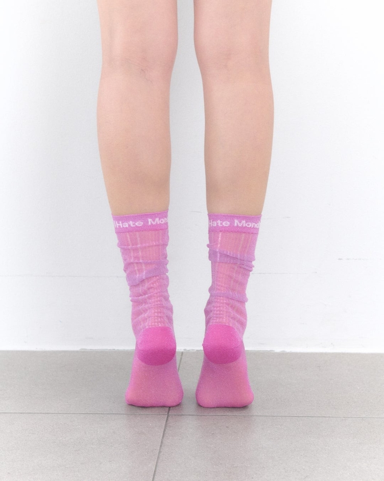 繊細なシアー素材にラメがきらめくロング丈ソックス。