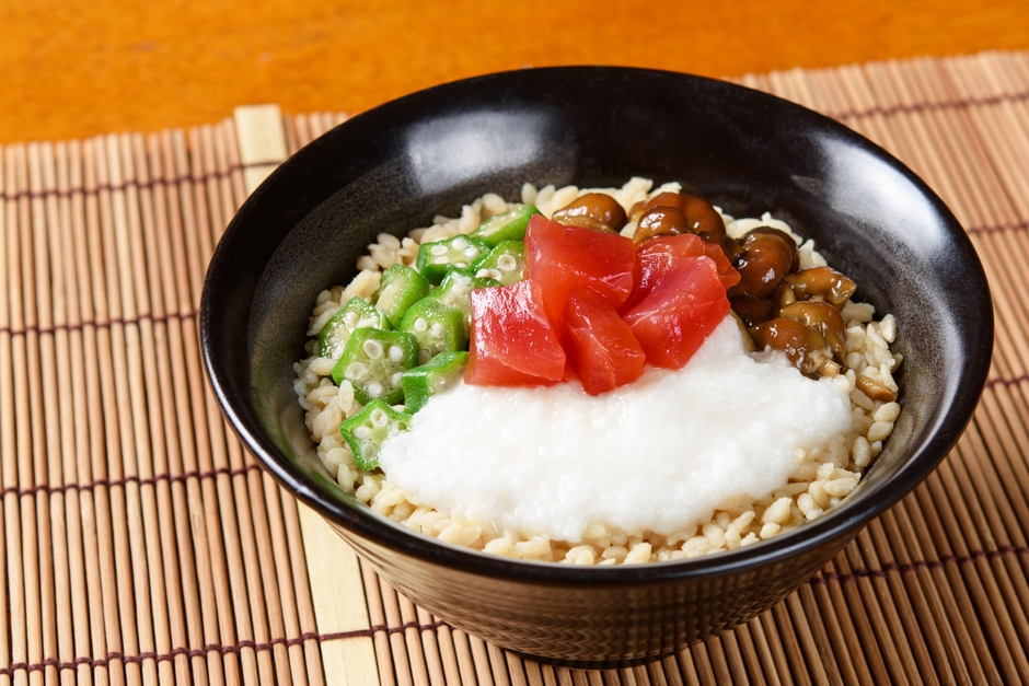 糖質を約90%カットした小樽ダイニングの大豆米に、醤油に漬けたマグロ、なめこ、オクラ、長芋のとろろをのせた山かけ丼は、食欲がない時でもかき込める夏におすすめの一品です。長芋やオクラに含まれるネバネバとした成分であるムチンは、胃の粘膜を保護する働きや、消化を促す作用があり、夏バテの防止にピッタリです。