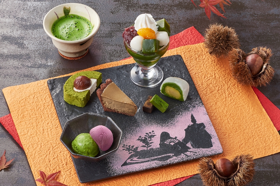 源氏物語「宇治十帖」をテーマにした季節限定のスイーツプレート。渋皮栗を乗せた抹茶ロールケーキ、栗抹茶だいふくに、宇治ほうじ茶チーズケーキ、宇治抹茶&ほうじ茶生チョコレート、宇治抹茶ミニパフェ、宇治抹茶&ぶどうアイスを添え、計8種がプレート上に勢揃いした季節限定の特別メニューです。