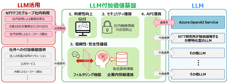 本実証実験では、生成AIを活用する際の安全性と利便性向上のためにNTTドコモ(以下、ドコモ)が開発した「LLM付加価値基盤」(以下、本基盤)をNTTドコモグループ3社で活用します。まずは、NTTドコモグループ3社の全従業員の業務効率化に向けて、例えば、業務における専門性の高い問い合わせに対し、社内ルールやマニュアルをベースにLLMが生成した文章で回答を行うなど、社内業務において本基盤を活用します。また、利便性や回答の正確性を検証し、お客さま応対業務などへの適用可否を検討します。本基盤は、今回の実証実験で得られたノウハウをもとに最適化を行い、法人のお客さまとの検証を経て、2023年度中のサービス提供開始をめざします。さらに本基盤を、ドコモが保有するビッグデータや音声認識/画像認識などのAI技術と組み合わせることで、法人のお客さまとともに新たな付加価値サービスの検討を開始します。