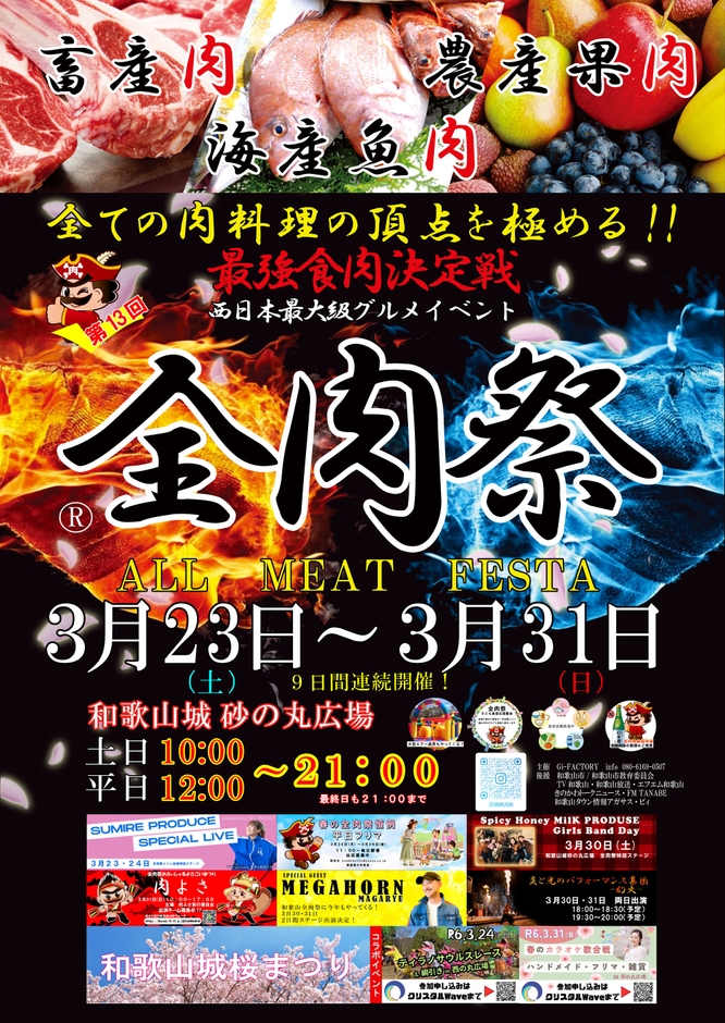 Gi-FACTORYは、和歌山・徳島・大阪・広島・山口・島根・岡山で開催している西日本最大級の大型野外グルメイベント『全肉祭』を2024年3月23日~3月31日の9日間、和歌山県和歌山市にある和歌山城砂の丸広場にて第13回開催を行います。