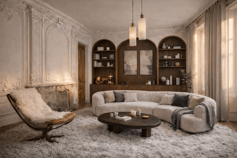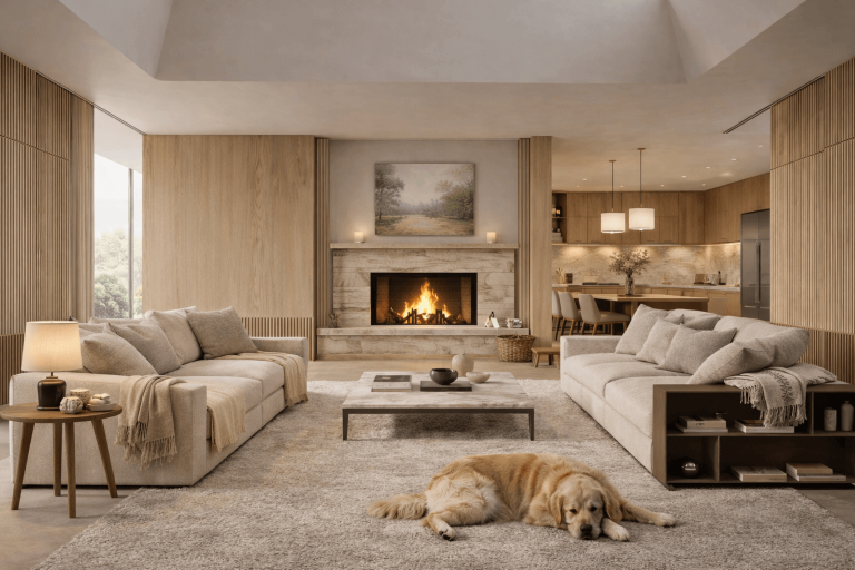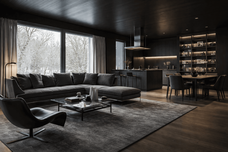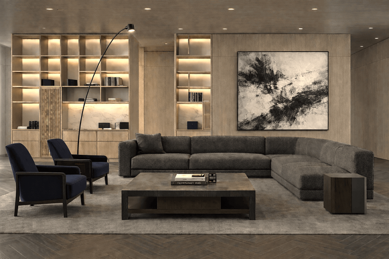 造作家具・既製家具・照明・カーテン・アートまでを計画段階から具体化。後付け感のない仕上がりを実現。