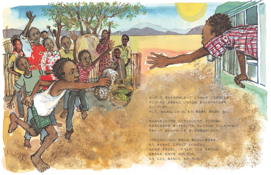 主人公は、スーダン内戦で難民となった少年サンゴール。物語の最大のテーマは「なまえ」だ。少年は一族の長老に「どこに行ってもおまえはディンカ(族)だ、どこに行ってもおまえはサンゴールだ」と励まされ、スーダンからアメリカへ向かう。安全だけれど慣れない大都会での生活、そして、「サンゴール」という名前を誰もきちんと呼んではくれず、学校でも名前をからかわれ、「ここでは、ぼくのなまえなんて なくなってしまったみたいだ。なんみんキャンプにかえりたい」と思い悩む。