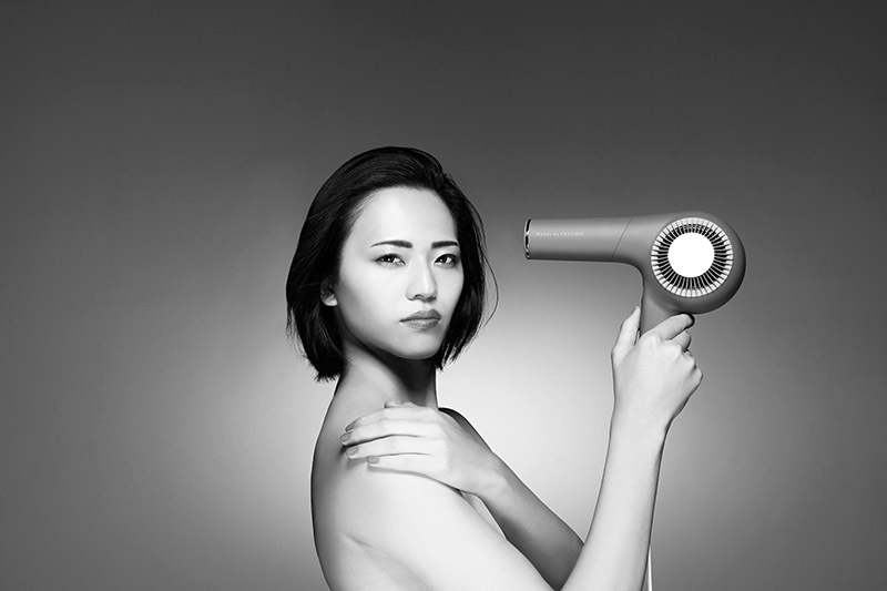 「普段から愛用しているNobby by TESCOMの撮影ということで、とても楽しみにしていました。新色のグレーは、レディースとメンズのどちらでもないジェンダーレスな印象です。この印象をレンズの向こう側に届けるために、白と黒のどちらでもない“自分らしさで染めていくような感じ”を表現してみました。」
