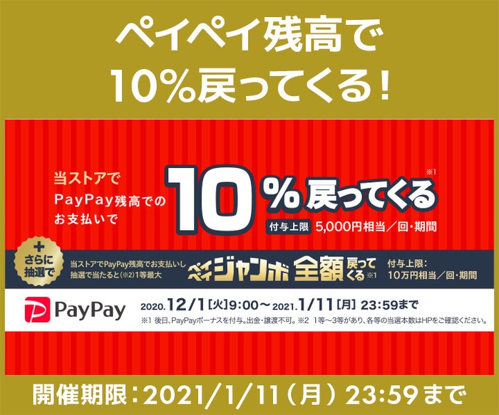 2021年1月11日(月)23:59までののキャンペーン期間中、PayPay残高でお支払いただくと、10%分のPayPayボーナス(ポイント)を付与します。